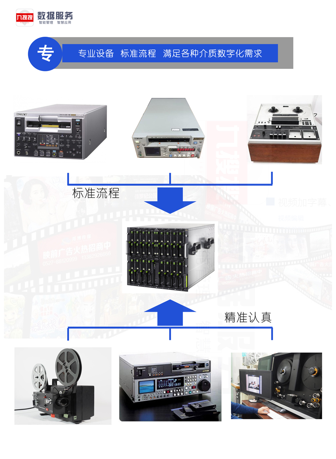 九搜搜公司现有经验丰富的管理团队,拥有各种影音介质数据专业读取设备近200余套。自主研发数字化加工管理系统流程,完善的管理制度和保密制度,为客户音像档案数字化服务提供有效的安全保障。为客户提供驻场、离场等多种服务模式。